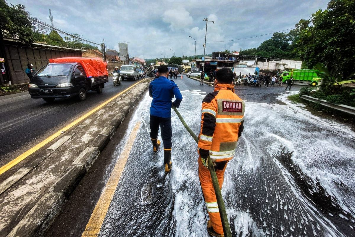 Petugas yang menerima laporan langsung bergerak cepat dan berhasil menghentikan truk tangki yang membawa cairan kimia berbahaya tersebut di wilayah Padalarang. Setelah itu, truk dan sopirnya diamankan untuk dimintai keterangan lebih lanjut. Berdasarkan surat jalan yang diperoleh dari sopir, cairan yang tumpah di jalan adalah caustic soda liquid dengan konsentrasi 48 persen.