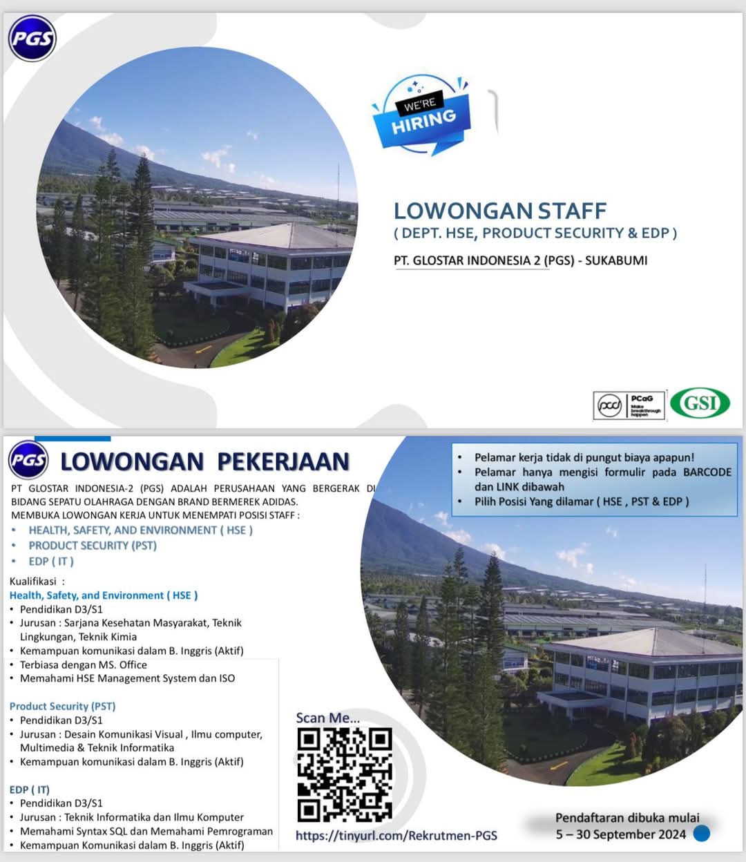 Pendaftaran dibuka mulai tanggal 5 hingga 30 September 2024, dengan formulir pendaftaran yang dapat diakses melalui barcode atau tautan https://tinyurl.com/Rekrutmen-PGS.