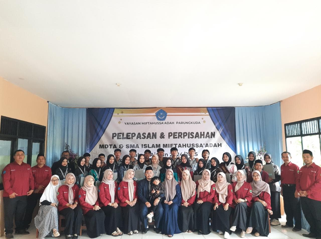 Kebersamaan yang tak terlupakan! Seluruh guru, siswa, dan panitia berfoto bersama dalam momen pelepasan dan perpisahan MDTA & SMA Islam Miftahussa’adah Tahun Ajaran 2024/2025. Acara penuh haru dan kehangatan ini digelar di Aula SMA Islam Miftahussa’adah, Parungkuda, Sukabumi, pada Minggu (29/6/2025).