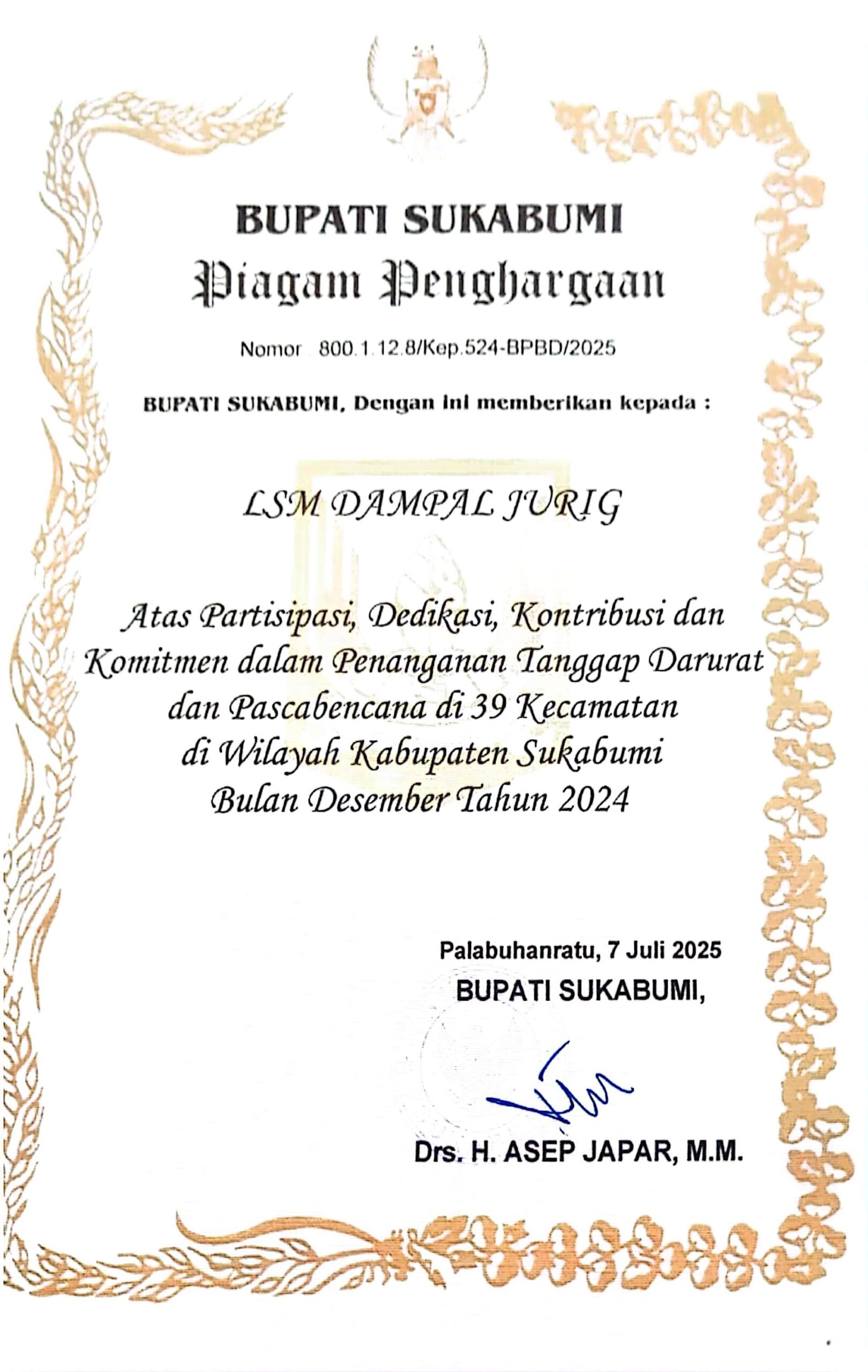 Piagam Penghargaan dari Bupati Sukabumi atas partisipasi, dedikasi, kontribusi, dan komitmen dalam penanganan tanggap darurat & pascabencana di 39 kecamatan Kabupaten Sukabumi pada Desember 2024.