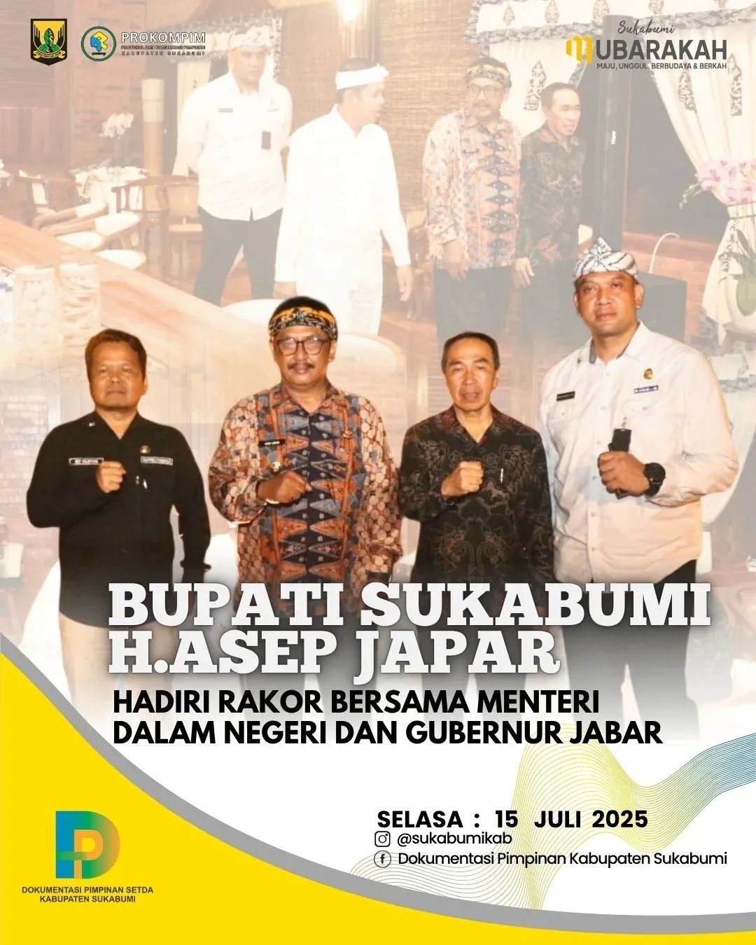 Sukabumi | Matanusa.net — Bupati Sukabumi H. Asep Japar beserta Sekretaris Daerah Kabupaten Sukabumi H. Ade Suryaman menghadiri Rapat Koordinasi bersama Menteri Dalam Negeri Republik Indonesia Tito Karnavian dan Gubernur Jawa Barat Dedi Mulyadi, yang digelar di Lembur Pakuan, Kabupaten Subang, pada Selasa (15/07/2025).