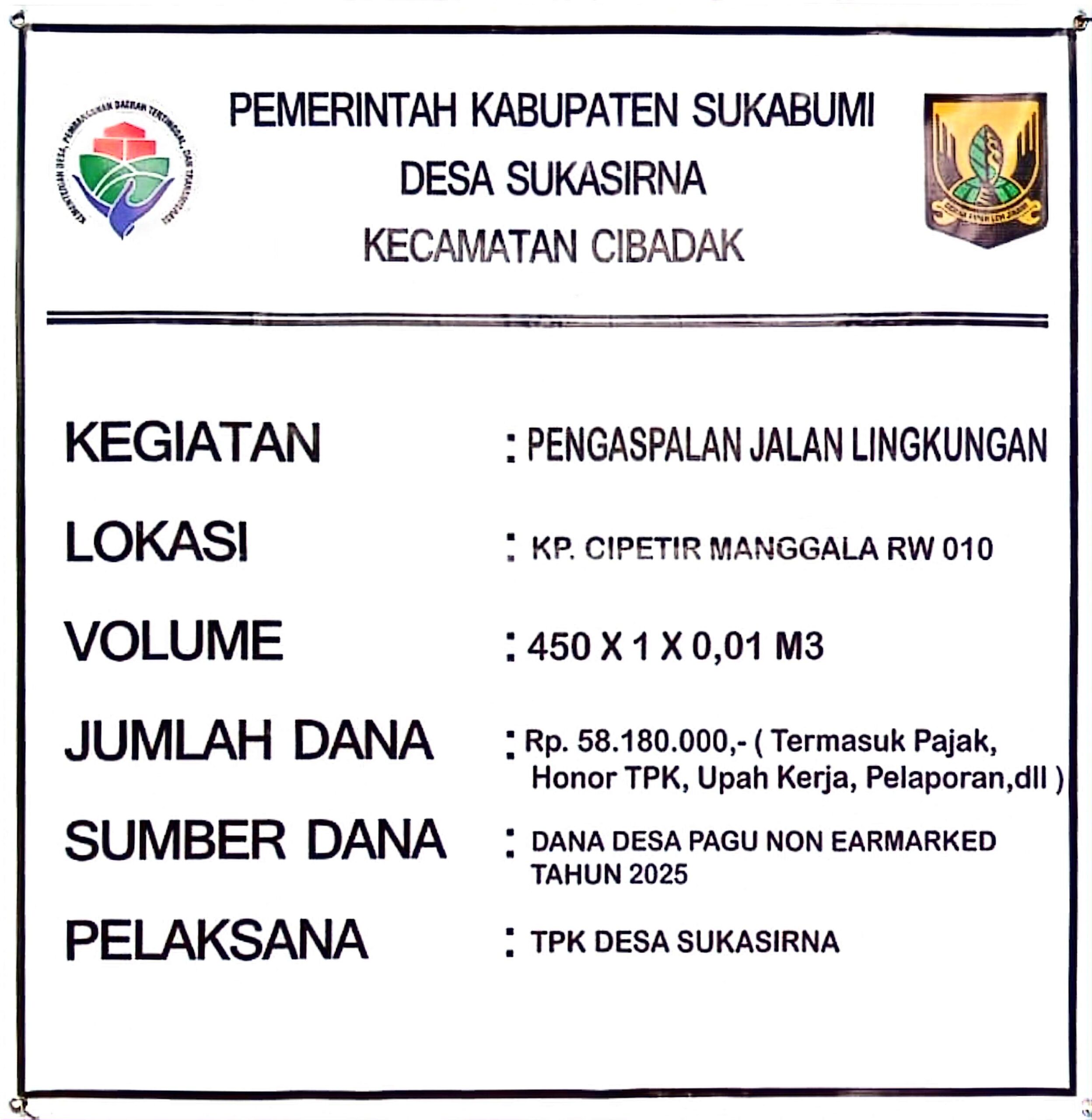 Pemerintah Desa Sukasirna, Kecamatan Cibadak, merealisasikan pembangunan jalan lingkungan sepanjang 450 meter melalui dana desa tahun anggaran 2025 senilai Rp 58.180.000. Proyek ini dilaksanakan oleh TPK Desa Sukasirna dengan partisipasi aktif masyarakat setempat.
