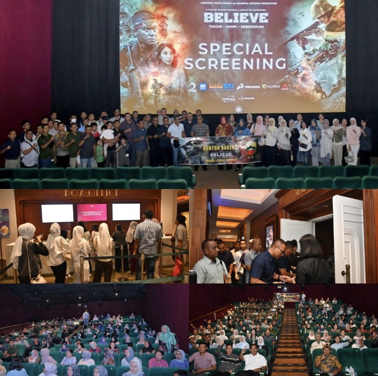 Pangdam I/BB Mayjen TNI Rio Firdianto bersama keluarga besar Kodam I/BB menghadiri nonton bareng film Believe: Takdir, Mimpi, dan Keberanian di Deli Park XXI Medan. Kegiatan ini sebagai refleksi nilai-nilai pengabdian, semangat juang, dan kecintaan terhadap Tanah Air. (Foto: Pangdam I/BB).