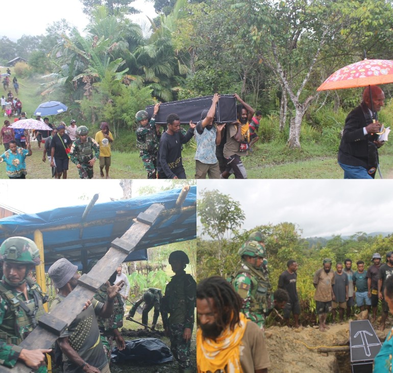 Selain menyerahkan bantuan, personel Satgas Yonif 521/DY turut membantu pengaturan prosesi duka cita dan berbaur dengan warga dalam tradisi bakar batu, sebuah ritual memasak bersama yang biasa dilakukan sebagai penghormatan kepada orang yang telah meninggal.