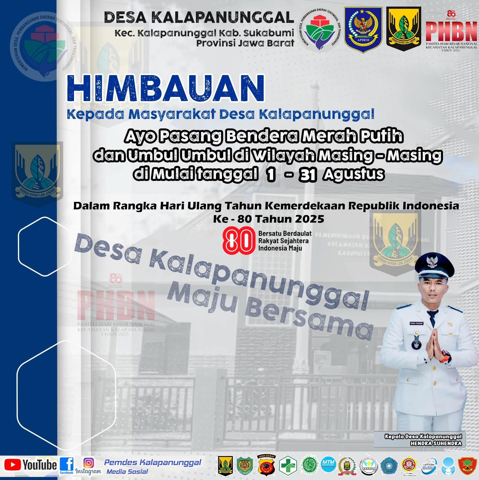 Melalui himbauan resmi yang disampaikan oleh Kepala Desa Kalapanunggal, Hendra Suhendra, masyarakat diminta untuk mengibarkan Bendera Merah Putih dan memasang umbul-umbul di lingkungan rumah masing-masing, tempat usaha, fasilitas umum, maupun kantor-kantor di wilayah Desa Kalapanunggal, Kecamatan Kalapanunggal, Kabupaten Sukabumi.