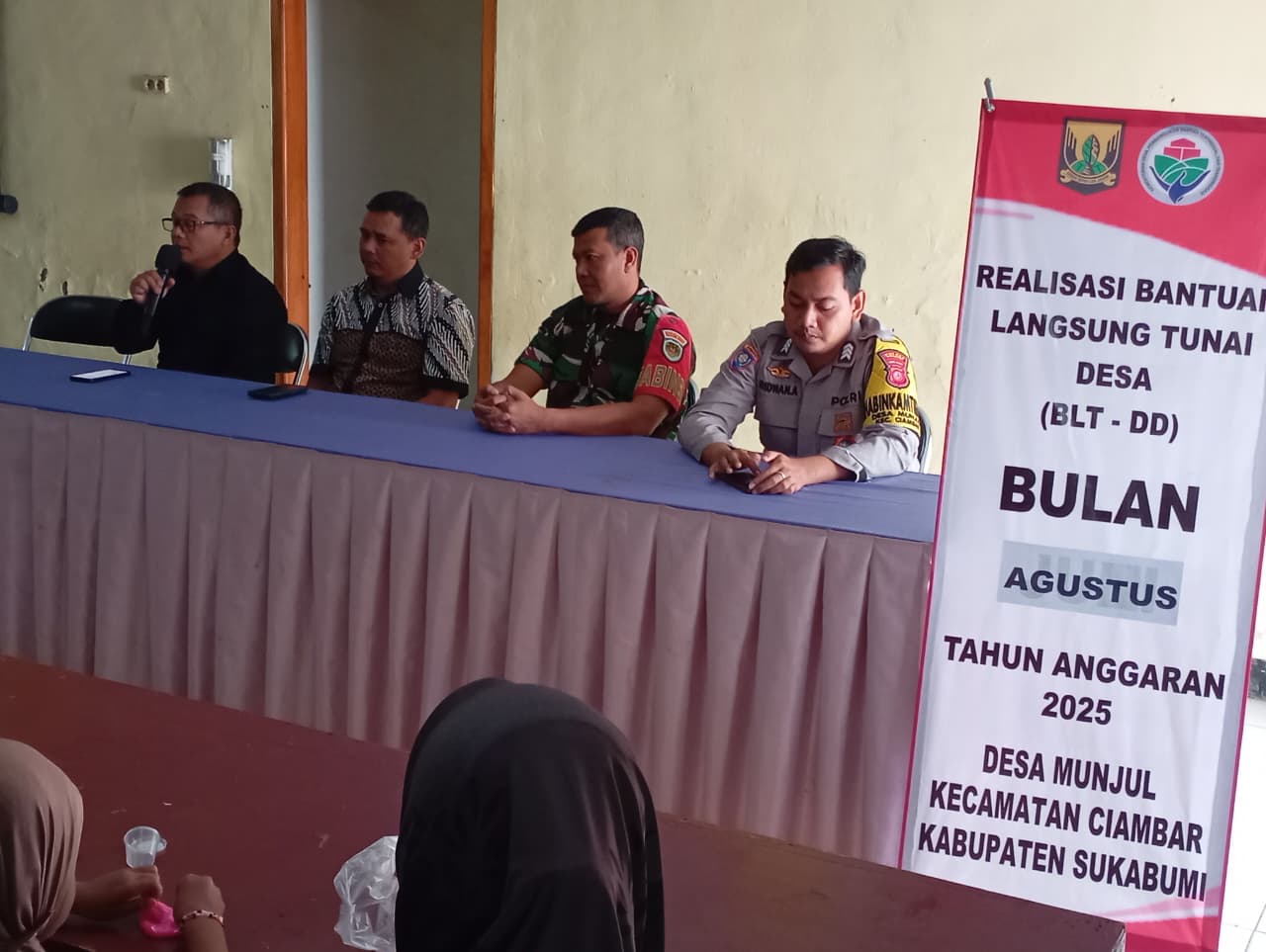 Penyaluran BLT Dana Desa Agustus 2025 di Desa Munjul, Kecamatan Ciambar, berlangsung tertib dengan pendampingan aparat TNI, Polri, dan perangkat desa untuk memastikan bantuan Rp300 ribu per KPM tersalurkan tepat sasaran.