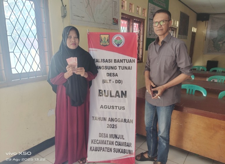 Sukabumi | Matanusa.net – Pemerintah Desa Munjul, Kecamatan Ciambar, Kabupaten Sukabumi, melaksanakan penyaluran Bantuan Langsung Tunai Dana Desa (BLT–DD) untuk periode Agustus 2025. Kegiatan yang digelar, pada Jumat (29/8/2025) di Aula Kantor Desa ini berlangsung lancar dan penuh semangat kebersamaan.