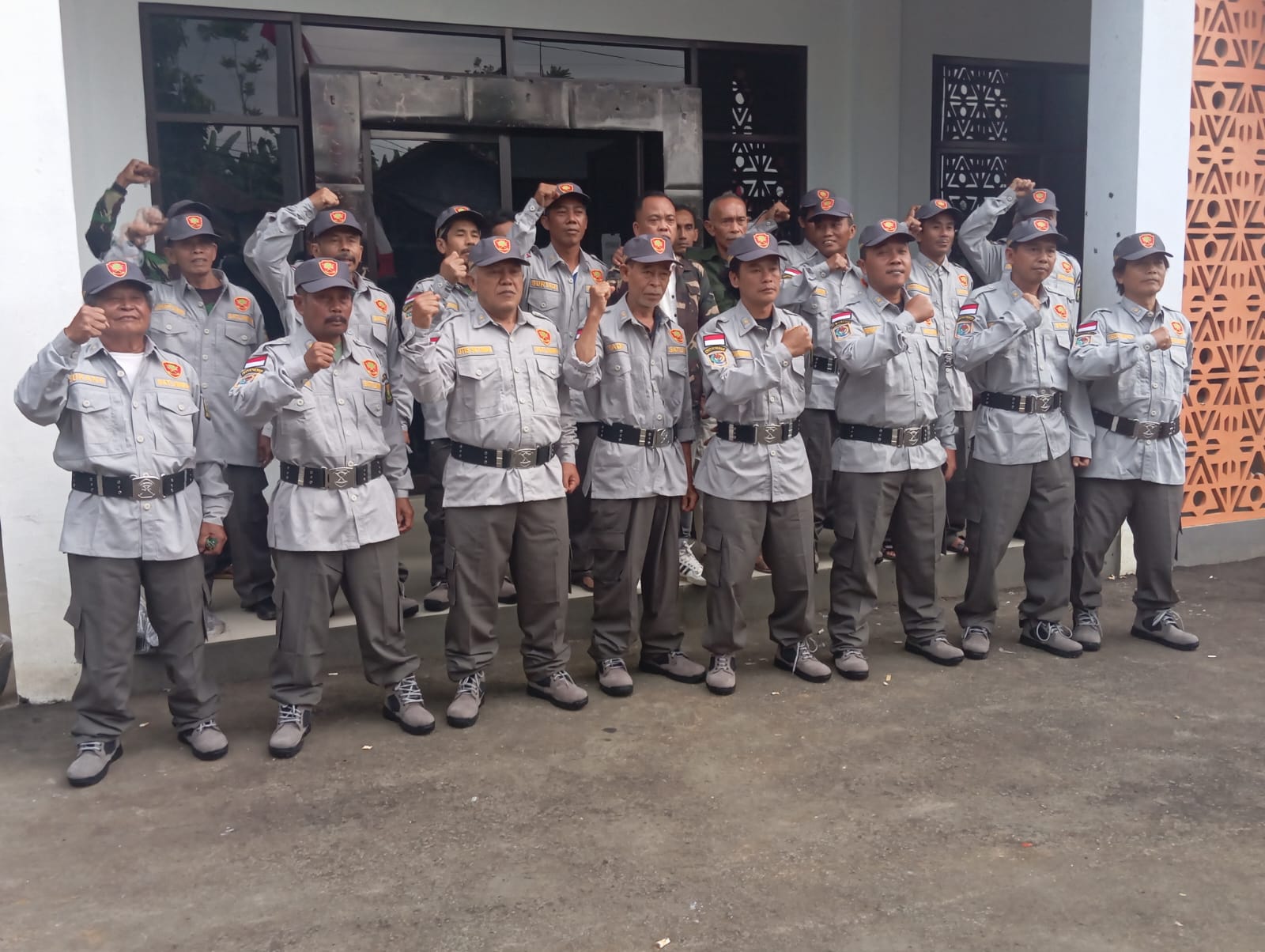 “Anggota Linmas Desa Kadununggal berpose dengan seragam baru usai penyerahan perlengkapan, sebagai simbol kesiapsiagaan dalam menjaga keamanan desa.”