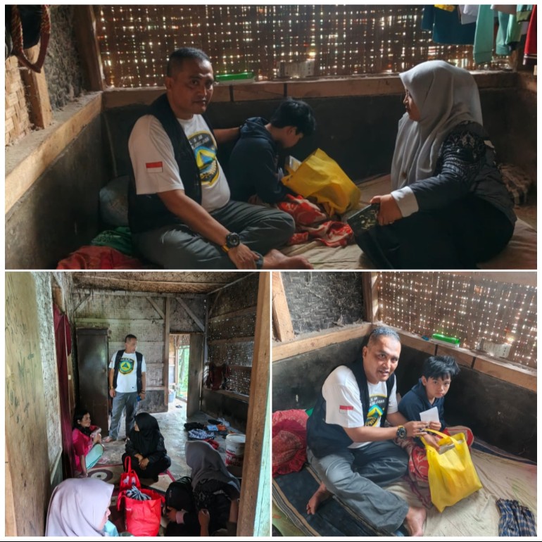 LSM Dampal Jurig, Irvan Azis, bersama Komite SDN Sungapan dan wali murid sambangi rumah Dede Rehan, siswa kurang mampu di Kadudampit, untuk bersilaturahmi dan menyerahkan bantuan sembako, perlengkapan ibadah, pakaian layak pakai, dan dana guna meringankan beban keluarga. (Foto: Irvan Azis).