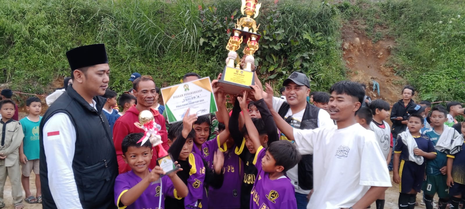 Momen penuh kebanggaan, Ketua LSM Dampal Jurig Irvan Azis menyerahkan piala dan piagam penghargaan kepada salah satu pemain muda berprestasi dalam turnamen sepak bola mini soccer Desa Kasep Cup.