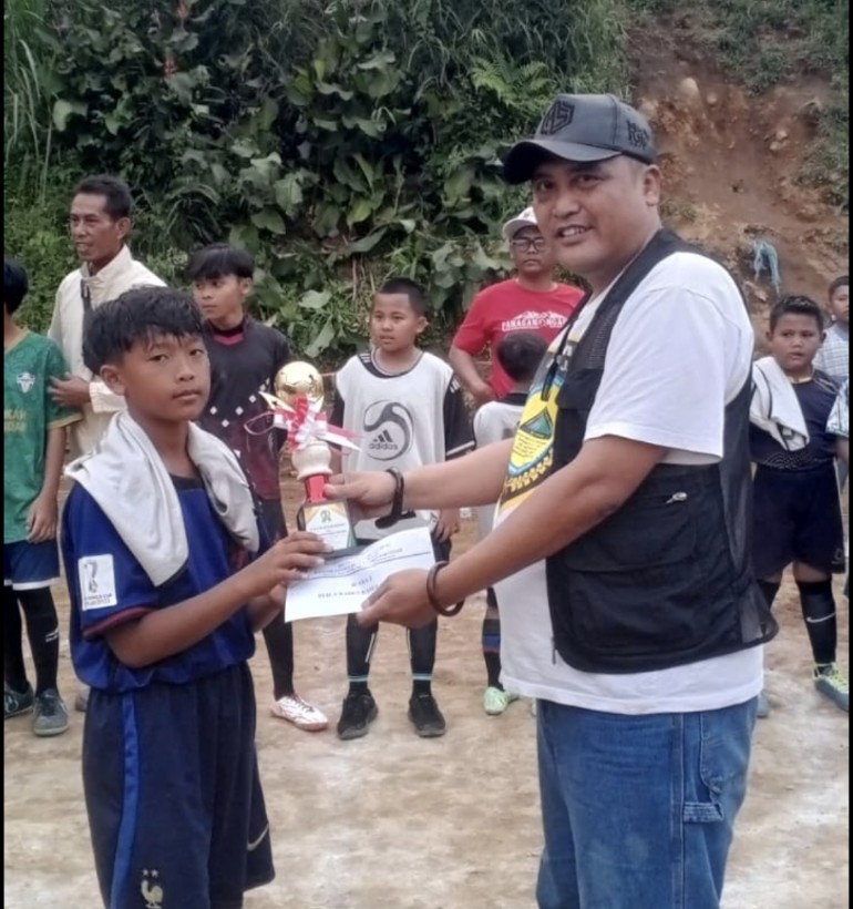 Momen penuh kebanggaan, Ketua LSM Dampal Jurig Irvan Azis menyerahkan piala dan piagam penghargaan kepada salah satu pemain muda berprestasi dalam turnamen sepak bola mini soccer Desa Kasep Cup. (Foto: Irvan Azis).