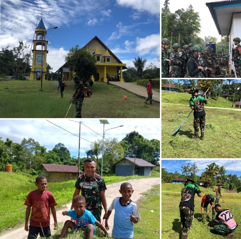Satgas Yonif 763/SBA Pos Bori Gelar Karya Bakti di Gereja Santa Monica, Wujudkan Kepedulian dan Kebersamaan