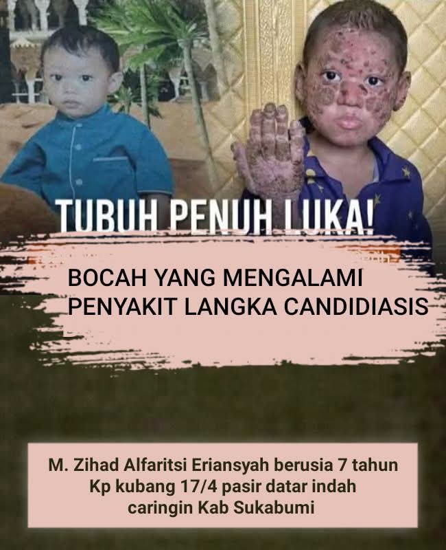 Sukabumi | Matanusa.net – Derita panjang yang dialami M. Zihad Alfaritsi Eriansyah (7), bocah asal Kampung Kubang RT 17/4, Desa Pasir Datar Indah, Kecamatan Caringin, Kabupaten Sukabumi, mengundang perhatian berbagai pihak. Putra pasangan Heri Eriansyah dan Yati Rohayati, seorang guru honorer, sejak usia satu tahun divonis menderita penyakit kulit langka Candidiasis.
