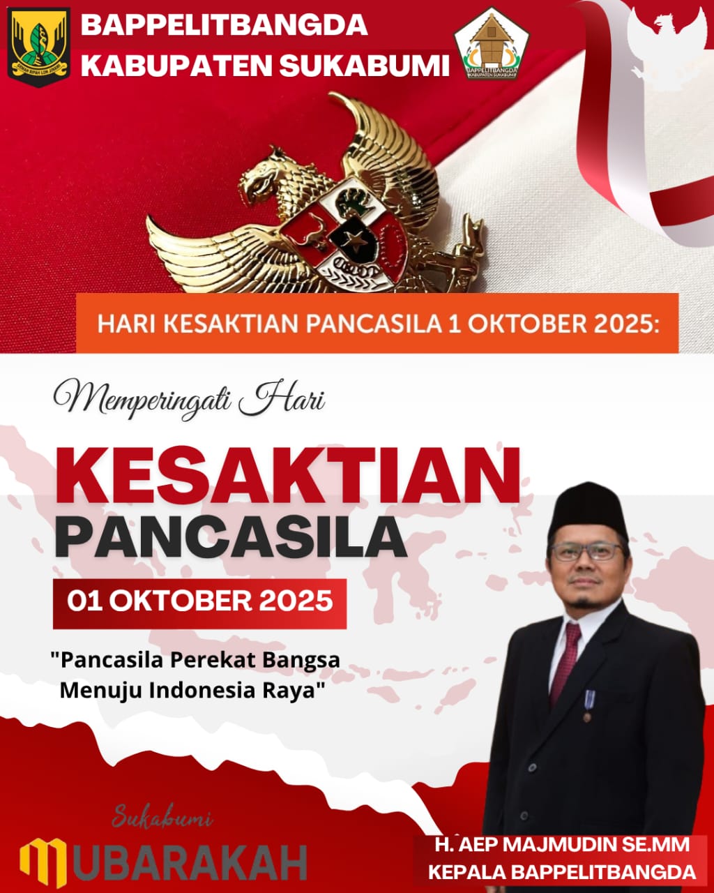 Sukabumi | Matanusa.net – Memperingati Hari Kesaktian Pancasila yang jatuh pada 1 Oktober 2025, Kepala Badan Perencanaan Pembangunan, Penelitian, dan Pengembangan Daerah (Bappelitbangda) Kabupaten Sukabumi, H. Aep Majmudin, SE., MM., menegaskan kembali pentingnya Pancasila sebagai dasar negara sekaligus pedoman dalam merancang pembangunan daerah.