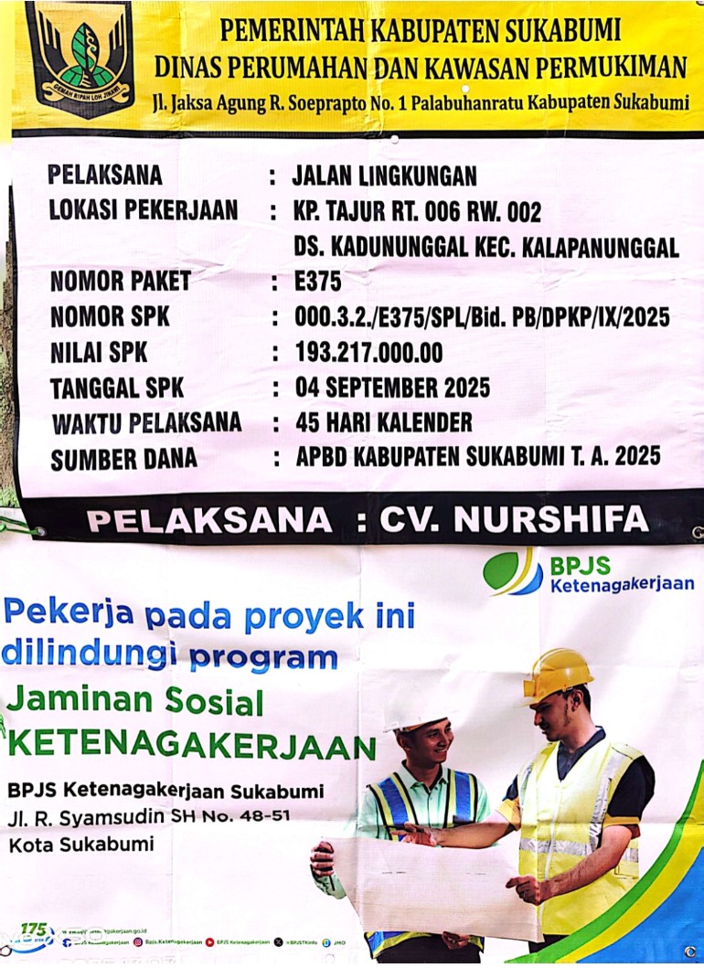 “Papan informasi pembangunan jalan lingkungan di Kampung Tajur RT 006 RW 002, Desa Kadununggal, Kecamatan Kalapanunggal. Proyek ini dilaksanakan oleh CV. Nurshifa dengan pengawasan Dinas Perumahan dan Kawasan Permukiman (Perkim) Kabupaten Sukabumi.”