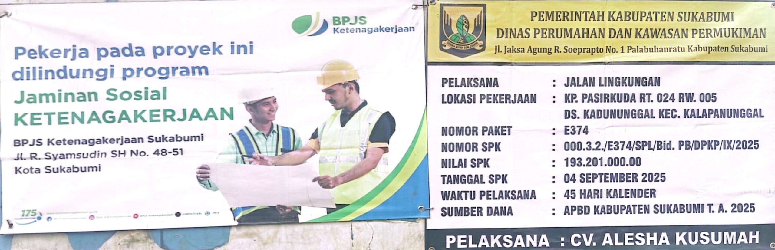 “Proyek jalan lingkungan Kadununggal resmi berjalan, pekerja terlindungi BPJS Ketenagakerjaan. Pelaksana: CV Alesha Kusumah, diawasi Disperkim Sukabumi.”