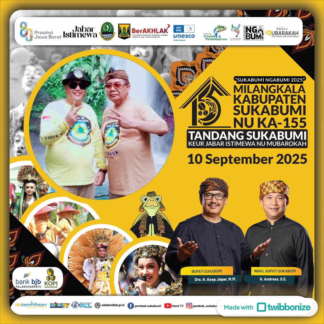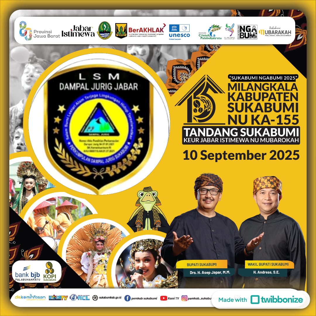 “Selamat Milangkala ke-155 Kabupaten Sukabumi! Bersama LSM Dampal Jurig Jabar, mari rawat alam dan lestarikan budaya demi Sukabumi yang istimewa, maju, dan mubarakah.”