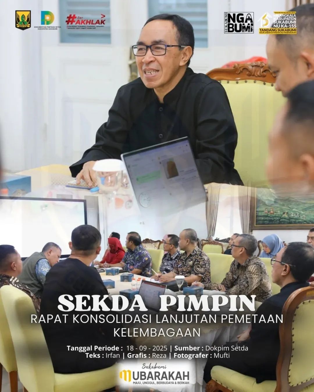 Sukabumi | Matanusa.net – Sekretaris Daerah Kabupaten Sukabumi, H. Ade Suryaman, SH., MM., memimpin Rapat Konsolidasi Lanjutan mengenai pemetaan kelembagaan di lingkungan Pemerintah Kabupaten Sukabumi. Kegiatan ini berlangsung di Pendopo Sukabumi, pada Kamis (18/09/2025).