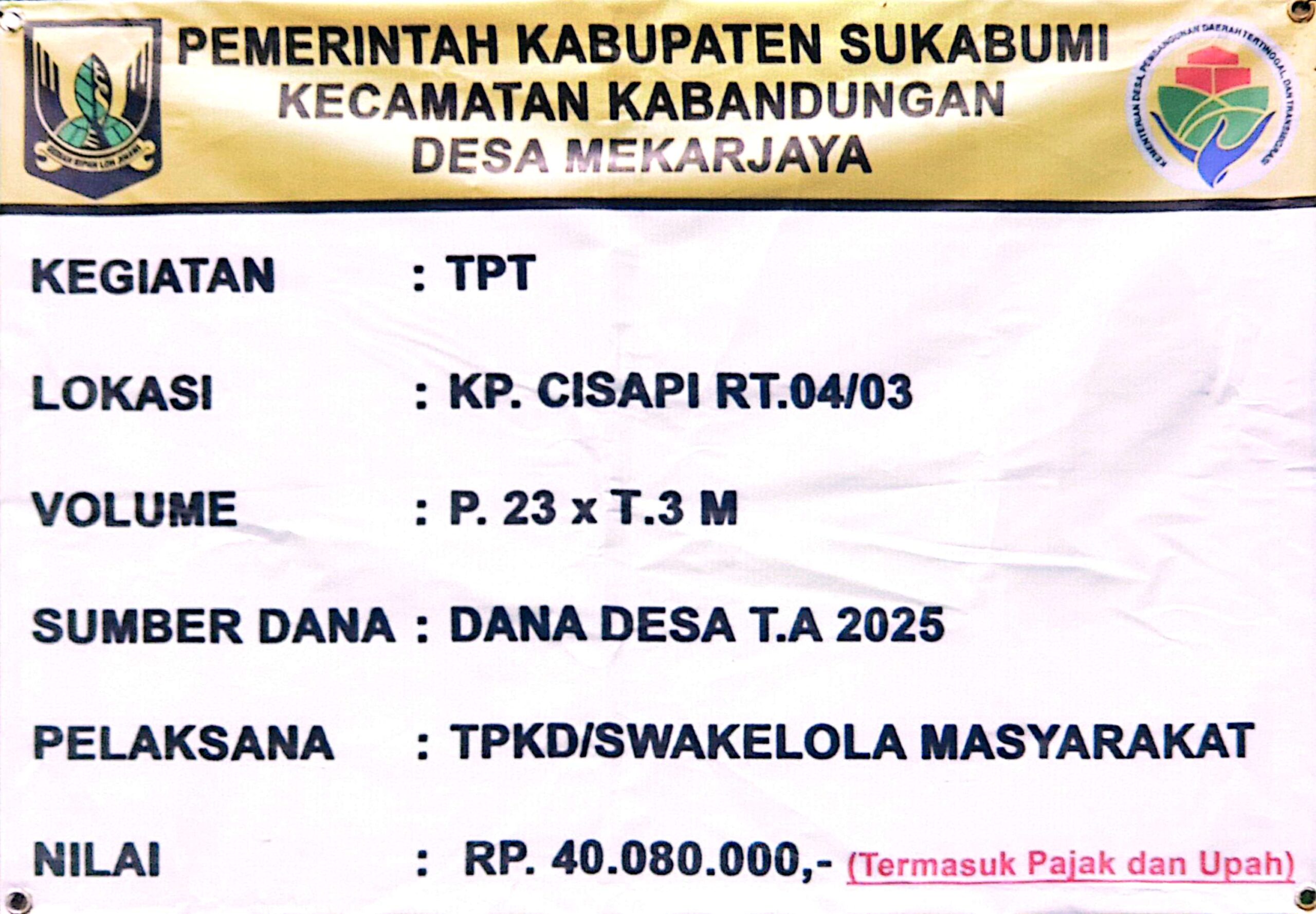 “Papan informasi pembangunan TPT di Kampung Cisapi RT 04/03 Desa Mekarjaya, Kecamatan Kabandungan. Pekerjaan dilaksanakan secara swakelola masyarakat melalui Dana Desa Tahun Anggaran 2025.”