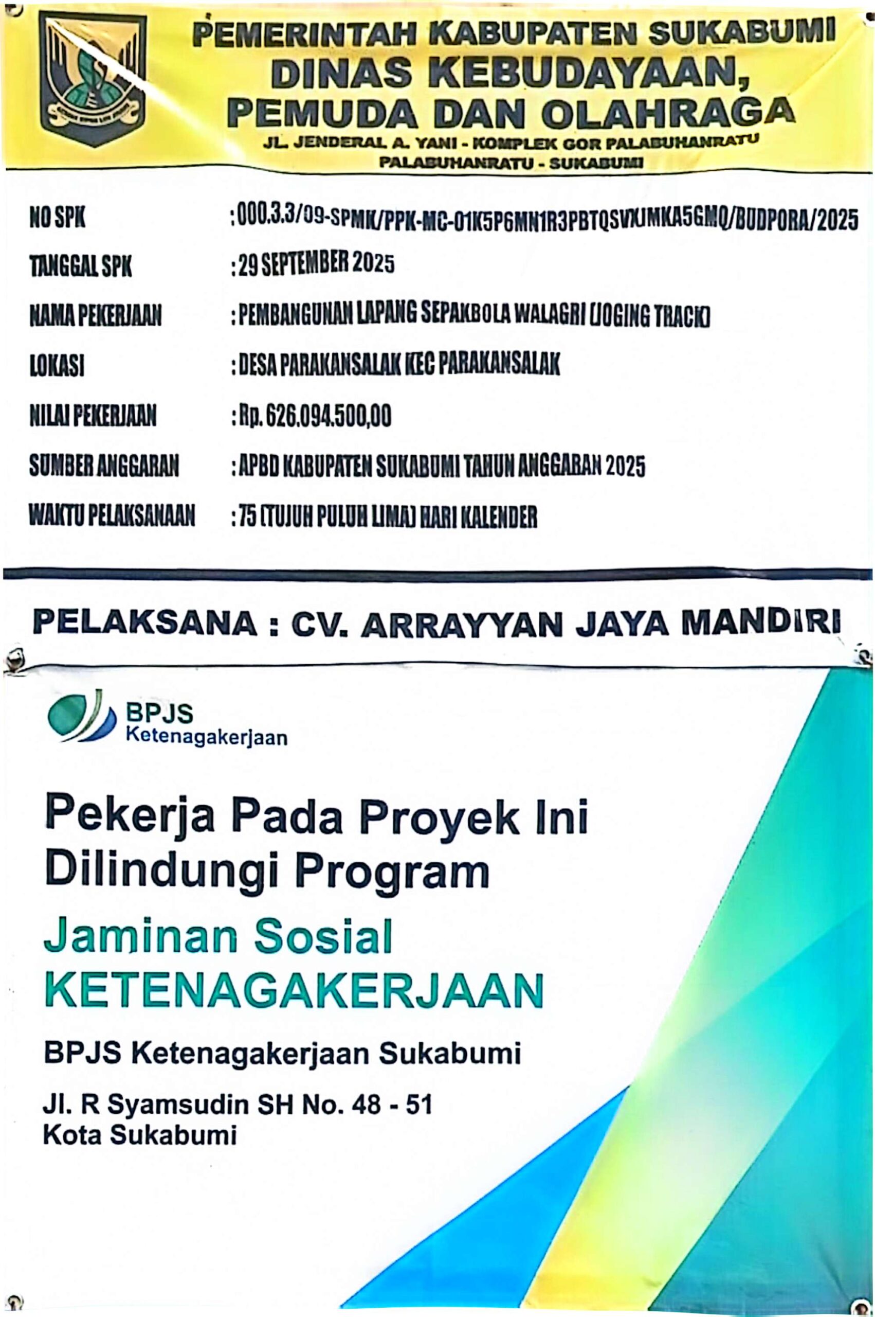Papan proyek pembangunan Lapang Sepakbola Walagri Jogging Track Parakansalak oleh Disbudpora Sukabumi bersama CV Arrayyan Jaya Mandiri.