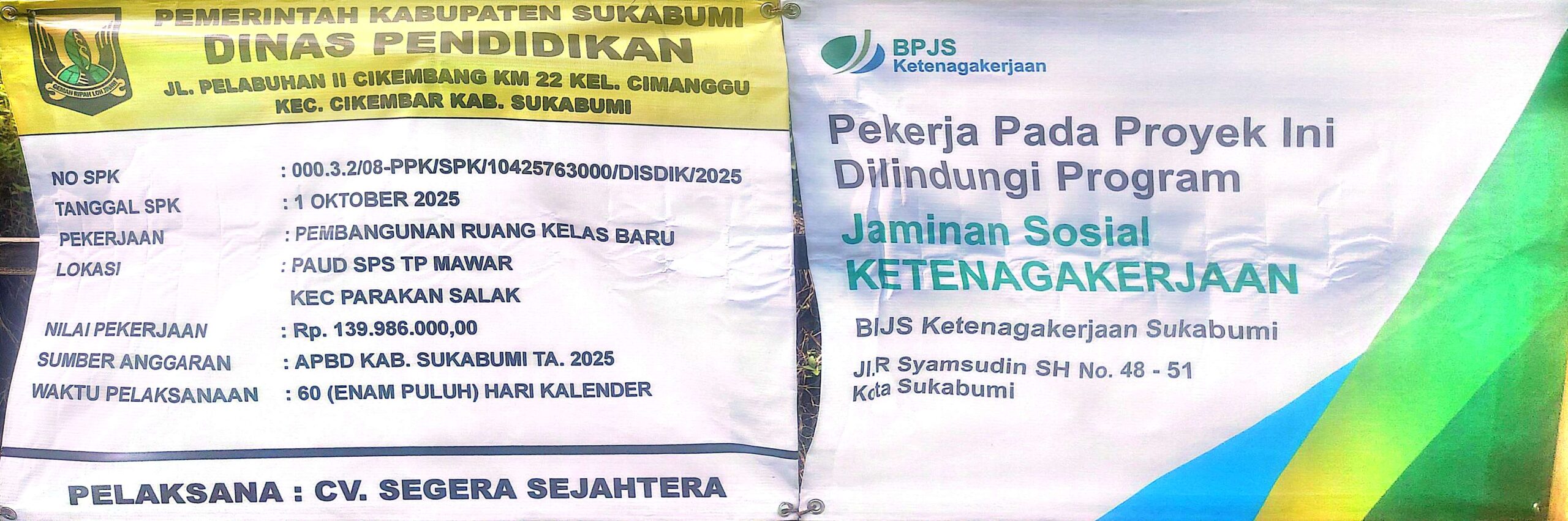 Papan informasi proyek pembangunan ruang kelas baru PAUD SPS TP Mawar oleh Dinas Pendidikan Kabupaten Sukabumi. Dilaksanakan oleh CV Segera Sejahtera dan seluruh pekerjanya terlindungi program BPJS Ketenagakerjaan.