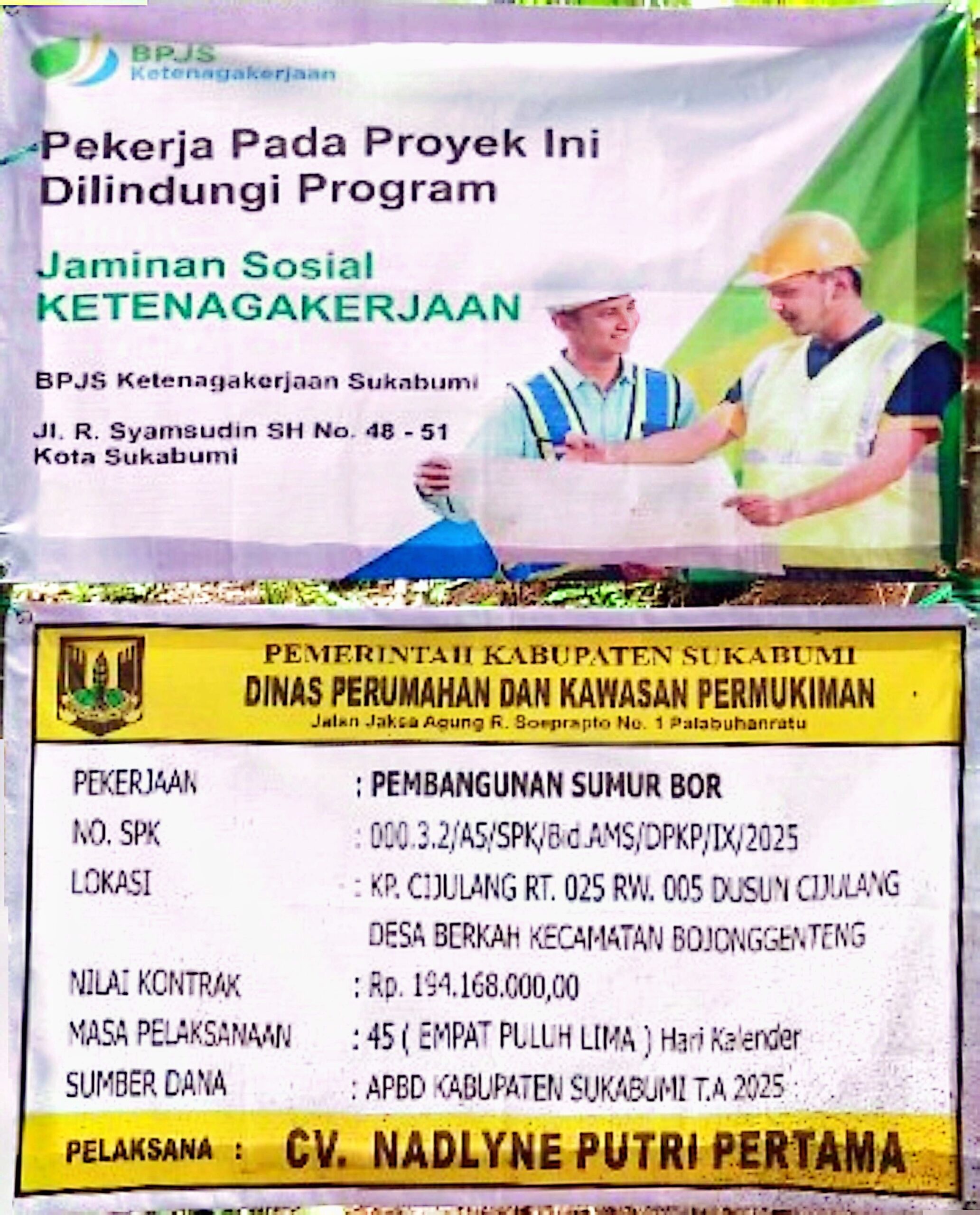 “Proyek pembangunan sumur bor di Desa Berkah, Kecamatan Bojonggenteng, dilaksanakan Disperkim Kabupaten Sukabumi bersama CV Nadlyne Putri Pertama. Pekerja pun terlindungi melalui program BPJS Ketenagakerjaan demi keamanan dan keselamatan kerja.”