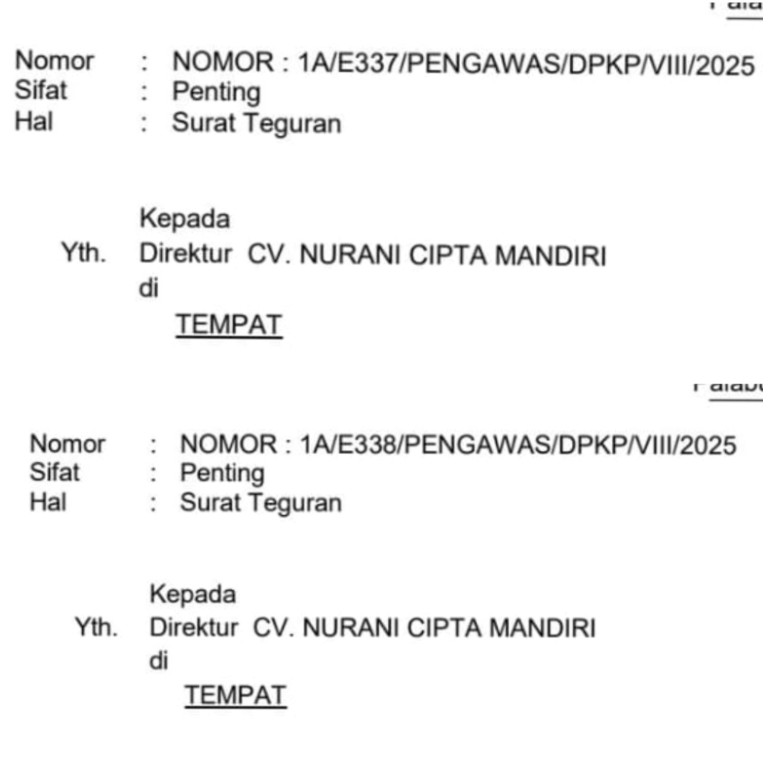 Surat teguran ini juga ditembuskan kepada Kepala Disperkim, Pejabat Pembuat Komitmen (PPK), PPTK, serta Tim Teknis, sebagai pengingat agar pekerjaan kembali pada jalur kontrak yang telah disepakati.