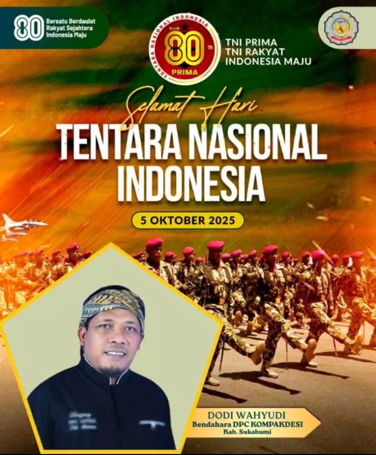 Sukabumi | Matanusa.net – Dalam rangka memperingati Hari Tentara Nasional Indonesia (TNI) ke-80 yang jatuh pada tanggal 5 Oktober 2025, Dewan Pimpinan Cabang Komunitas Purna Bakti Kepala Desa dan Lurah Seluruh Indonesia (DPC Kompakdesi) Kabupaten Sukabumi menyampaikan ucapan selamat serta apresiasi setinggi-tingginya kepada seluruh prajurit TNI di Tanah Air.