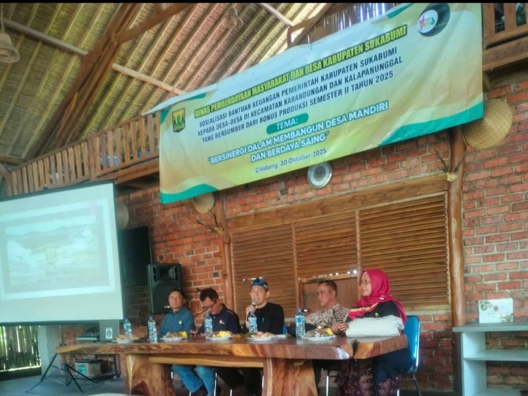 Sukabumi | Matanusa.net — Dinas Pemberdayaan Masyarakat dan Desa (DPMD) Kabupaten Sukabumi terus berkomitmen memperkuat pembangunan desa. Salah satu upayanya diwujudkan melalui kegiatan Sosialisasi Bantuan Keuangan Pemerintah Kabupaten Sukabumi, yang digelar bagi desa-desa di Kecamatan Kabandungan dan Kalapanunggal. Kegiatan berlangsung di sebuah aula bernuansa alami di wilayah Cikidang, Kecamatan Cikidang, Kabupaten Sukabumi mengusung tema “Bersinergi Dalam Membangun Desa Mandiri dan Berdaya Saing.”