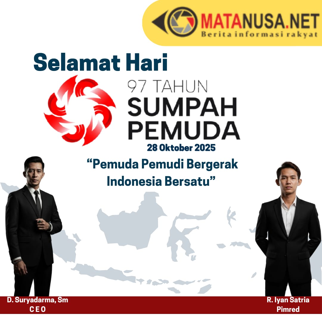 Sukabumi | Matanusa.net – Semangat Sumpah Pemuda ke-97 tahun 2025 berkumandang di Matanusa.net, portal berita yang berkomitmen menyajikan informasi akurat dan berpihak pada kepentingan rakyat. Mengangkat tema “Pemuda Pemudi Bergerak, Indonesia Bersatu,” Matanusa.net mengajak seluruh elemen bangsa, khususnya generasi muda, untuk merajut kembali persatuan dan kesatuan di tengah berbagai tantangan global.