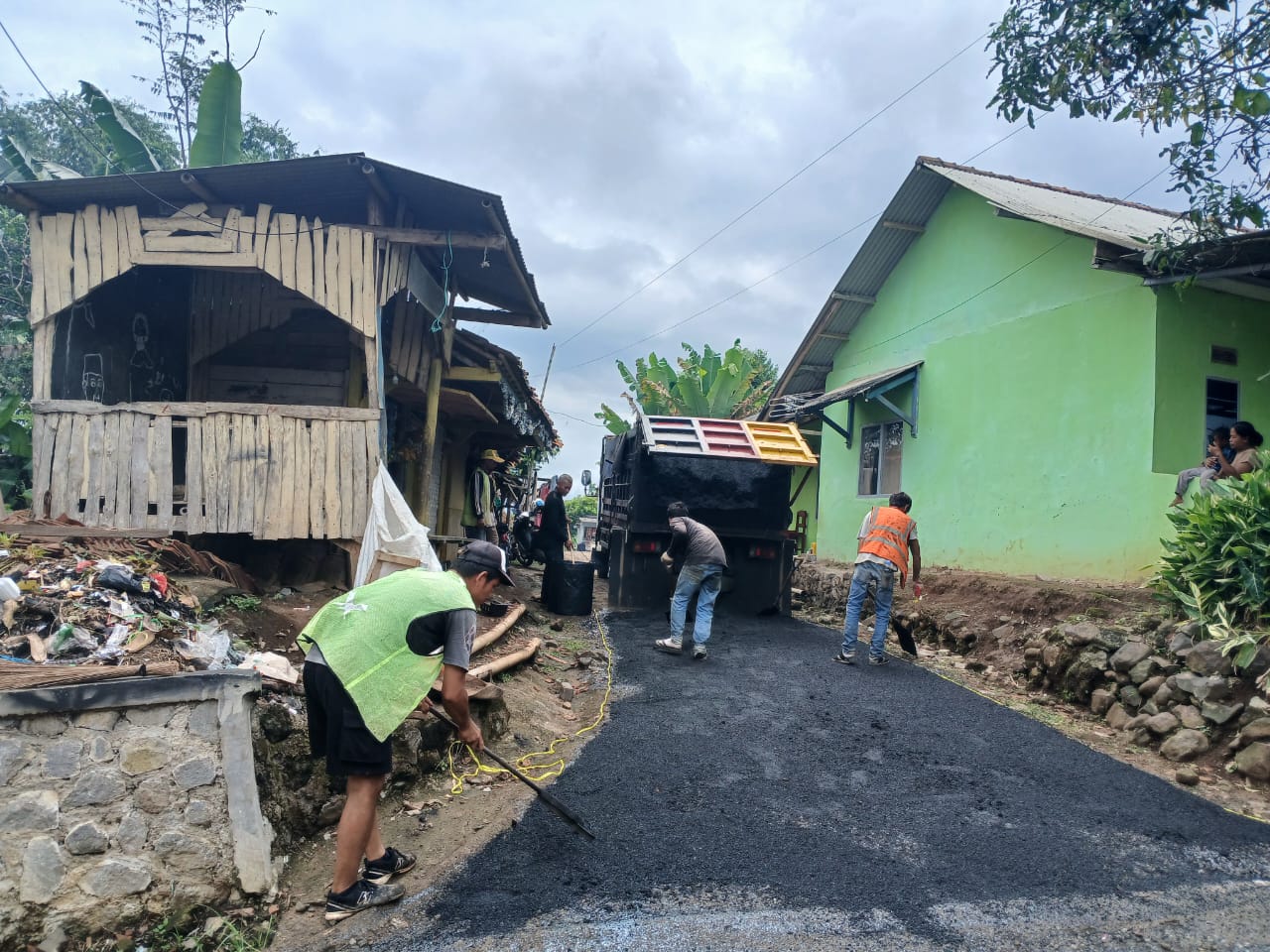 Pekerjaan pengaspalan jalan lingkungan di Desa Kadununggal oleh CV. Shakir Januar di bawah pengawasan Dinas Perkim Sukabumi. (Foto: R. Iyan Satria).