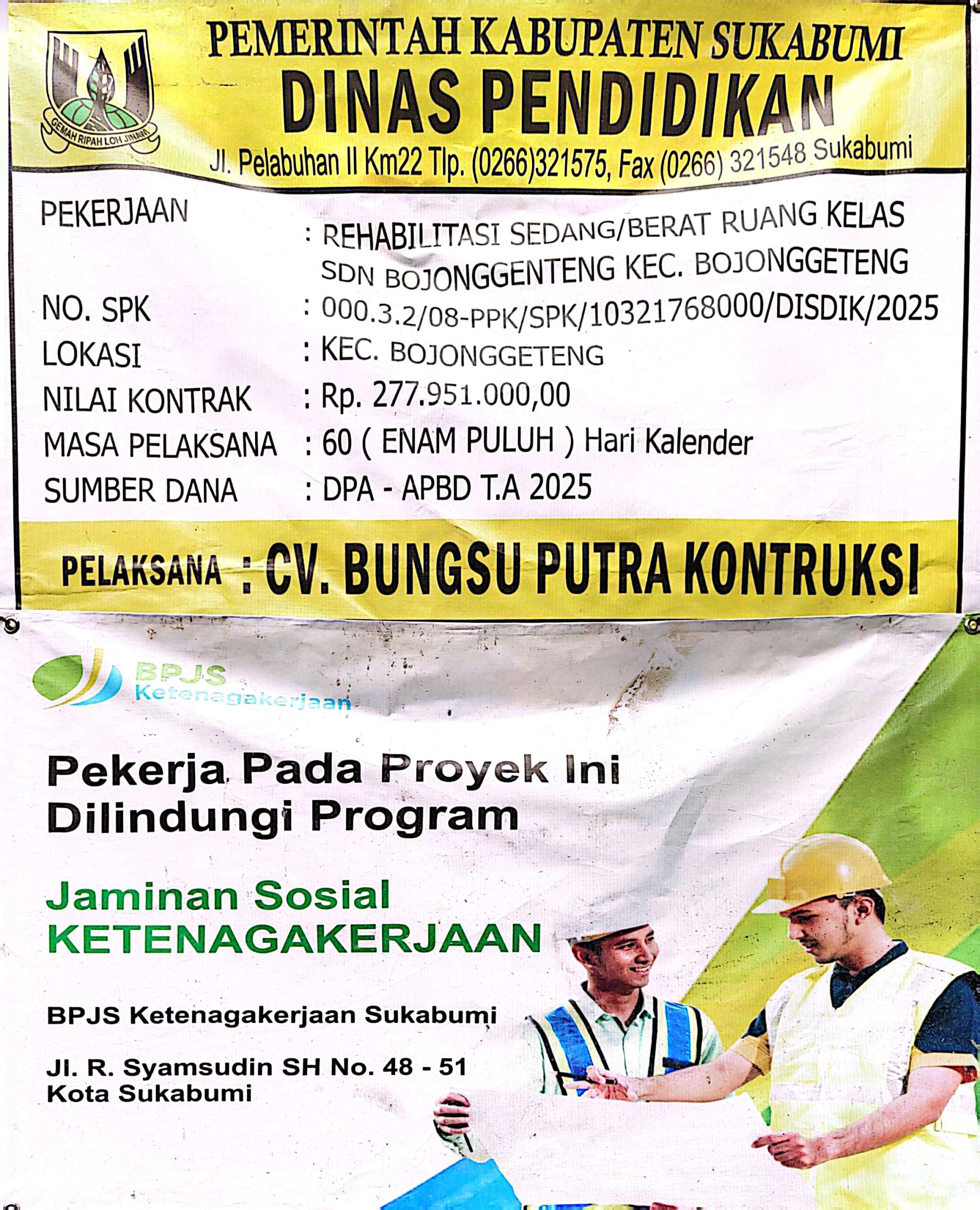 Papan proyek rehabilitasi sedang/berat ruang kelas SDN Bojonggenteng Kecamatan Bojonggenteng, Kabupaten Sukabumi. Proyek ini dilaksanakan oleh CV. Bungsu Putra Konstruksi dan bersumber dari DPA-APBD Tahun Anggaran 2025.