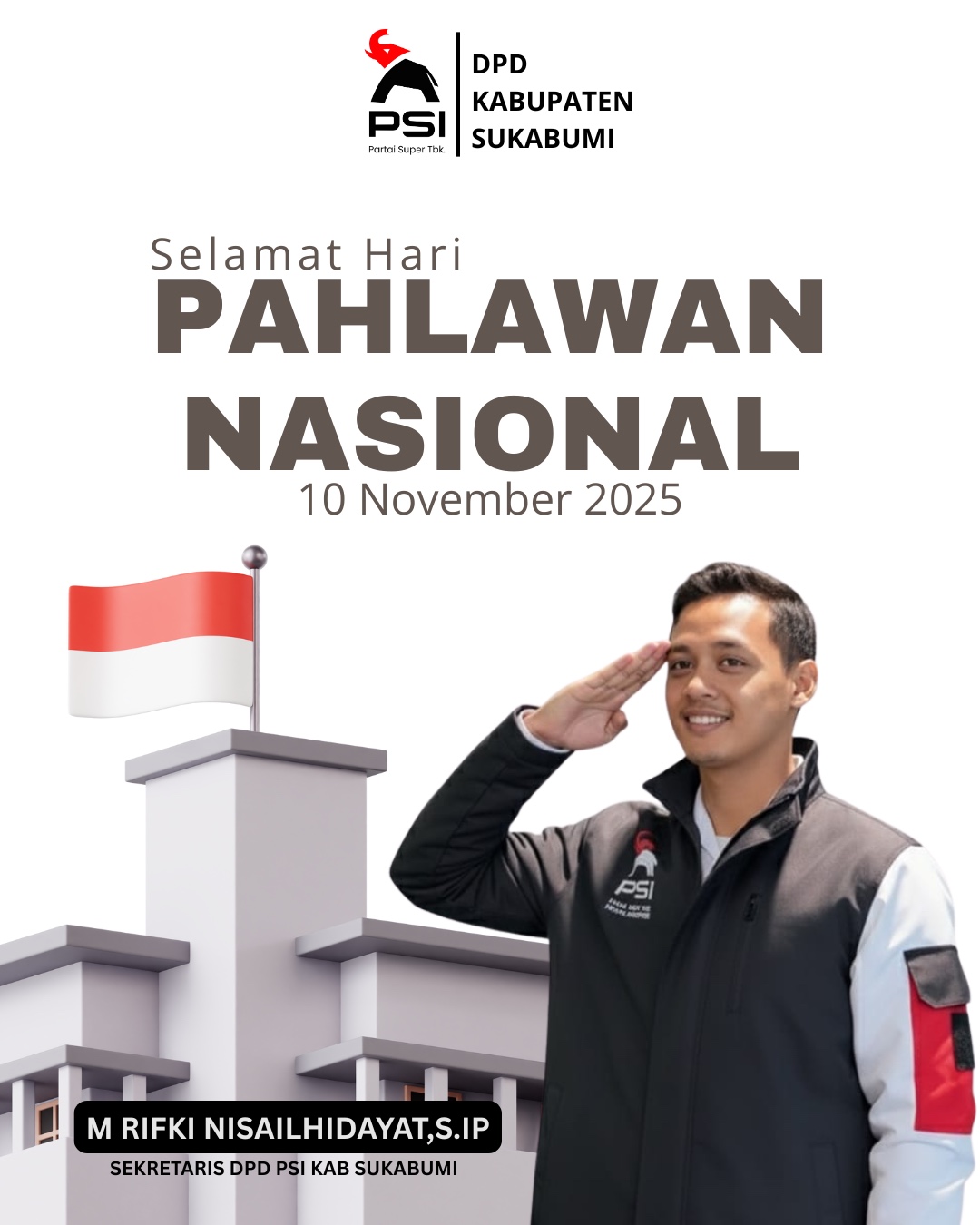 Melalui unggahan resmi yang menampilkan ucapan “Selamat Hari Pahlawan Nasional 10 November 2025”, Sekretaris DPD PSI Kabupaten Sukabumi, M. Rifki Nisailhidayat, S.IP, menyampaikan penghormatan kepada seluruh pahlawan yang telah berjuang demi kemerdekaan dan kemajuan Indonesia.