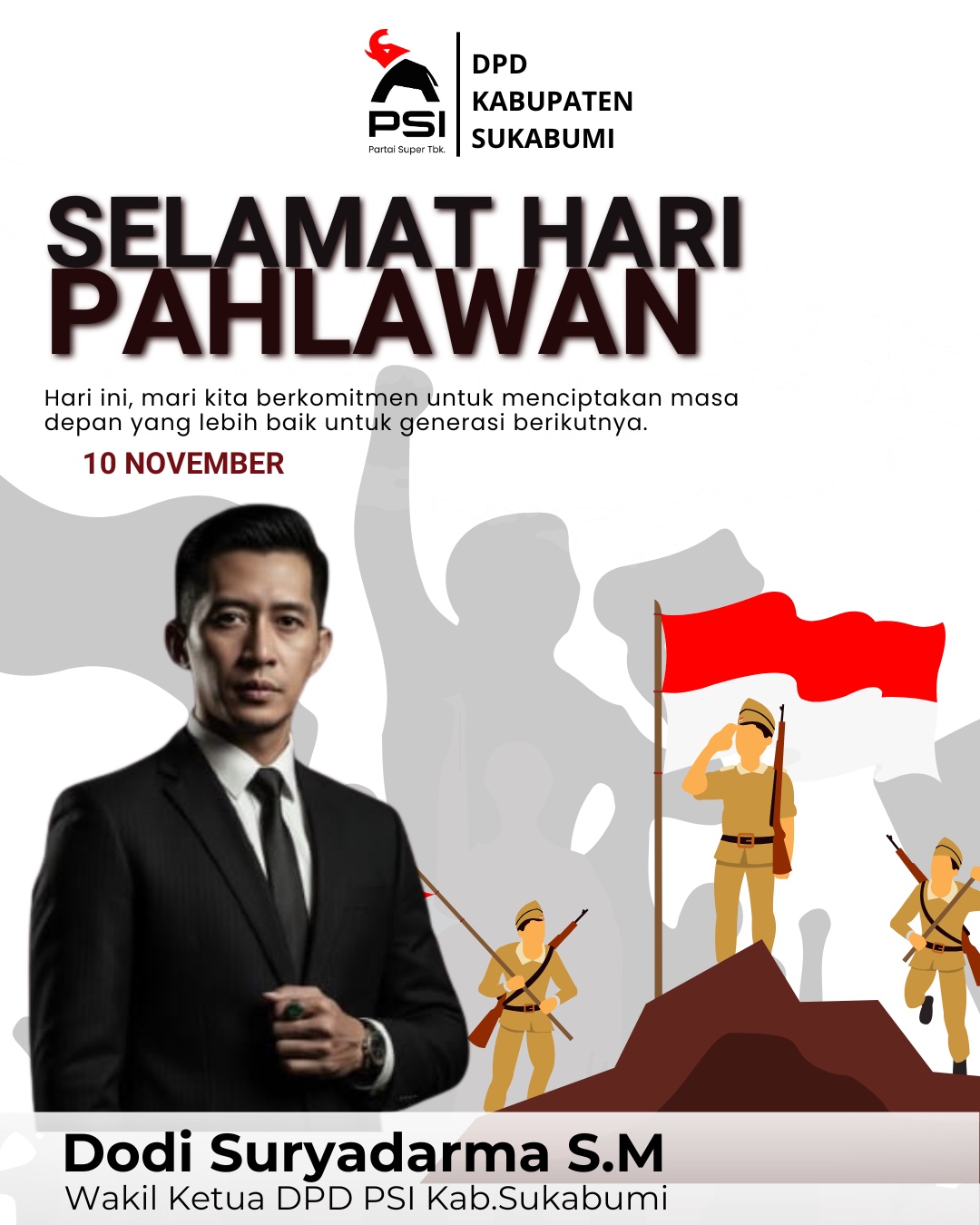 ​Dodi Suryadarma, S.M, Wakil Ketua DPD PSI Kabupaten Sukabumi, yang fotonya terpampang dalam poster tersebut, menjadi representasi ajakan ini. Dodi mengajak seluruh elemen masyarakat, terutama kaum muda, untuk meneruskan semangat juang para pahlawan bukan hanya dengan mengingat, tetapi dengan aksi nyata dan kontribusi positif dalam pembangunan bangsa dan daerah.