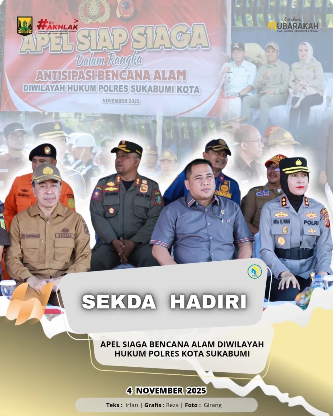 Sukabumi | Matanusa.net — Sekretaris Daerah Kabupaten Sukabumi, H. Ade Suryaman, SH., MM., mewakili Bupati Sukabumi menghadiri Apel Siaga Bencana Alam dalam rangka antisipasi potensi bencana di wilayah hukum Polres Sukabumi Kota. Kegiatan berlangsung di Alun-Alun Kota Sukabumi, pada Selasa (4/11/2025).