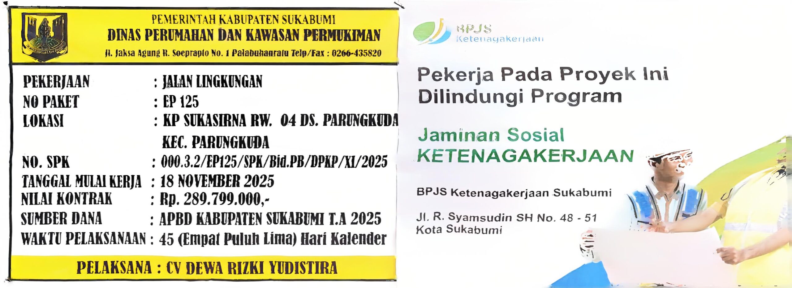 Proyek yang bersumber dari APBD Kabupaten Sukabumi Tahun Anggaran 2025 ini memiliki nilai kontrak Rp 289.799.000, dengan masa pelaksanaan 45 hari kalender, dimulai pada 18 November 2025.