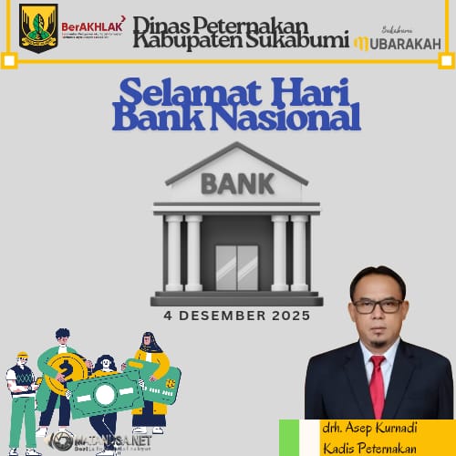 Sukabumi | Matanusa.net – Kepala Dinas Peternakan Kabupaten Sukabumi, drh. Asep Kurnadi, menyampaikan ucapan Selamat Hari Bank Nasional yang diperingati pada 4 Desember 2025. Peringatan ini menjadi momen penting untuk mengapresiasi peran sektor perbankan dalam menjaga stabilitas ekonomi nasional dan mendukung berbagai program pembangunan daerah, termasuk di sektor peternakan.