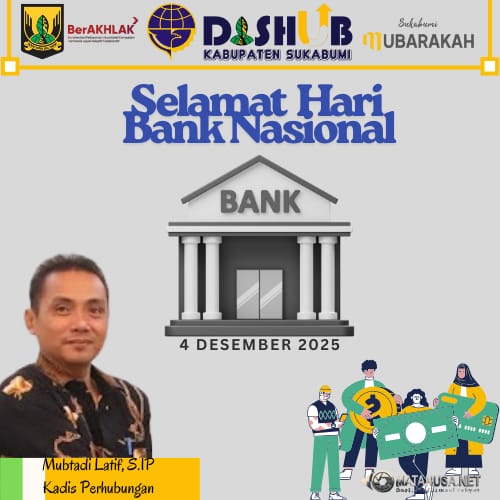 Sukabumi | Matanusa.net – Kepala Dinas Perhubungan (Dishub) Kabupaten Sukabumi, Mubtadi Latip, S.IP., menyampaikan ucapan Selamat Hari Bank Nasional, yang diperingati pada 4 Desember 2025. Peringatan ini menjadi momentum penting untuk mengapresiasi kontribusi sektor perbankan dalam menjaga stabilitas ekonomi dan mendukung pembangunan nasional, termasuk pada sektor transportasi dan perhubungan.