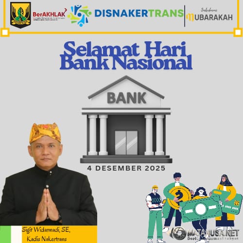 Sukabumi | Matanusa.net – Kepala Dinas Tenaga Kerja dan Transmigrasi (Disnakertrans) Kabupaten Sukabumi, Sigit Widarmadi, SE, menyampaikan ucapan Selamat Hari Bank Nasional yang diperingati pada 4 Desember 2025. Peringatan ini menjadi kesempatan untuk mengapresiasi peran penting sektor perbankan dalam mendukung stabilitas ekonomi, penguatan ketenagakerjaan, serta peningkatan kesejahteraan masyarakat.