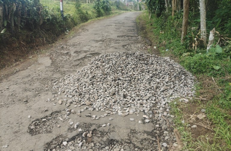 Material batu split telah tiba di lokasi sebagai langkah awal pekerjaan peningkatan jalan lingkungan yang dilaksanakan oleh CV Bintang Mas di bawah pengawasan Disperkim Kabupaten Sukabumi. (Foto: R. Iyan Satria).