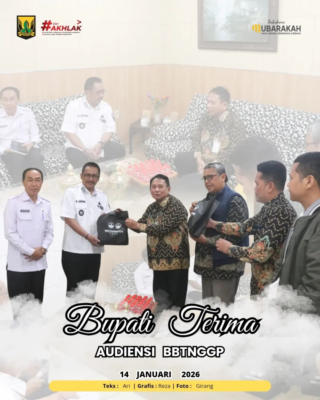 Sukabumi | Matnusa.net – Bupati Sukabumi, H. Asep Japar, didampingi Sekretaris Daerah Kabupaten Sukabumi H. Ade Suryaman, menerima audiensi Wakil Pelaksana Harian (Plh.) Kepala Balai Besar Taman Nasional Gunung Gede Pangrango (BBTNGGP) di Rumah Dinas Pendopo Sukabumi, pada Rabu (14/01/2026).