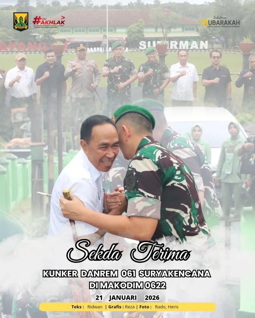 Kedatangan Danrem beserta jajaran disambut langsung oleh Sekretaris Daerah Kabupaten Sukabumi, H. Ade Suryaman, bersama Komandan Distrik Militer (Dandim) 0622/Kabupaten Sukabumi, Letkol Inf Agung Ari Wibowo, di halaman Makodim 0622.