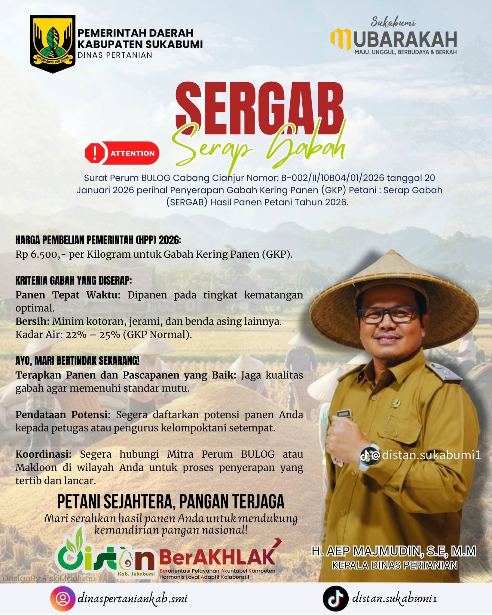 Kepala Dinas Pertanian Kabupaten Sukabumi, H. Aep Majmudin, S.E., M.M., mengajak seluruh petani untuk menerapkan panen dan pascapanen yang baik serta segera melakukan pendataan potensi panen melalui petugas atau kelompok tani setempat.