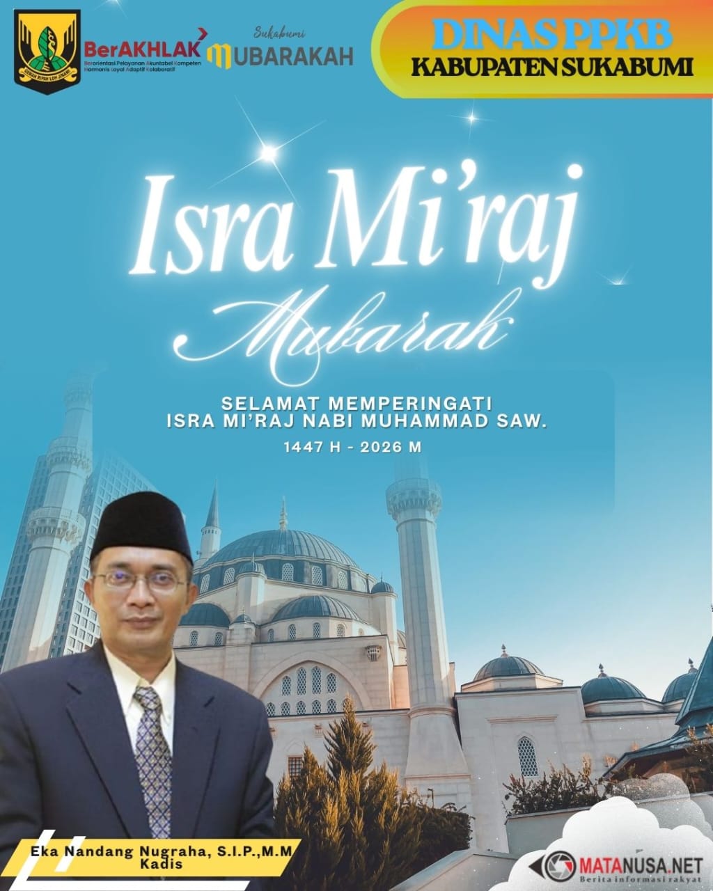 Sukabumi | Matanusa.net — Peringatan Isra Mi’raj Nabi Muhammad SAW 1447 Hijriah/2026 M 16 Januari 2026 dimaknai Kepala Dinas Pengendalian Penduduk dan Keluarga Berencana (DPPKB) Kabupaten Sukabumi, Eka Nandang Nugraha, S.IP., M.M., sebagai momentum refleksi spiritual untuk memperkuat tanggung jawab dalam membangun keluarga yang berkualitas dan berdaya saing.