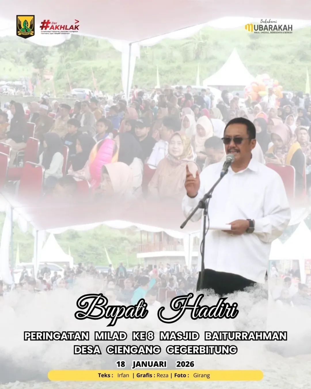 Sukabumi | Matanusa.net – Bupati Sukabumi H. Asep Japar menghadiri peringatan Milad ke-8 Masjid Baiturrahman yang dirangkaikan dengan peletakan batu pertama pembangunan Puskesmas Pembantu (Pustu) Baiturrahman, bertempat di Kampung Cibogo, Desa Ciengang, Kecamatan Gegerbitung, Kabupaten Sukabumi, pada Minggu (18/1/2026).
