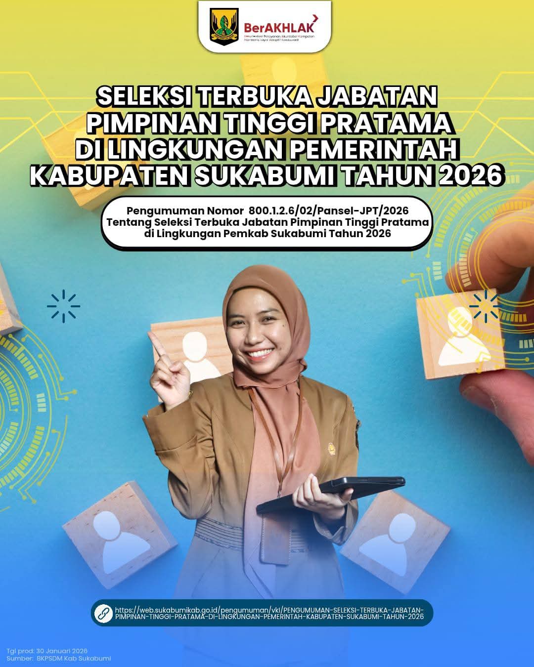 Pemerintah Kabupaten Sukabumi mengajak seluruh ASN yang memenuhi syarat untuk berpartisipasi aktif dan mengambil peran strategis dalam membangun birokrasi yang unggul, profesional, dan berdaya saing demi terwujudnya tata kelola pemerintahan yang lebih baik.