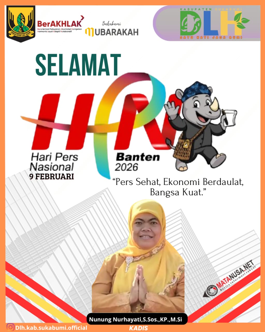 Sukabumi | Matanusa.net – Kepala Dinas Lingkungan Hidup (DLH) Kabupaten Sukabumi, Nunung Nurhayati, menyampaikan ucapan Selamat Hari Pers Nasional (HPN) Tahun 2026 yang diperingati pada 9 Februari 2026. Peringatan HPN tahun ini mengusung tema “Pers Sehat, Ekonomi Berdaulat, Bangsa Kuat” dan dilaksanakan secara nasional di Provinsi Banten.