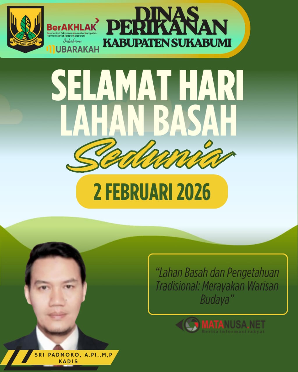 Melalui peringatan Hari Lahan Basah Sedunia 2026, Dinas Perikanan Kabupaten Sukabumi mengajak seluruh elemen masyarakat untuk bersama-sama menjaga dan melestarikan lahan basah, guna mendukung keberlanjutan sektor perikanan serta mewariskan lingkungan yang sehat dan produktif bagi generasi mendatang.