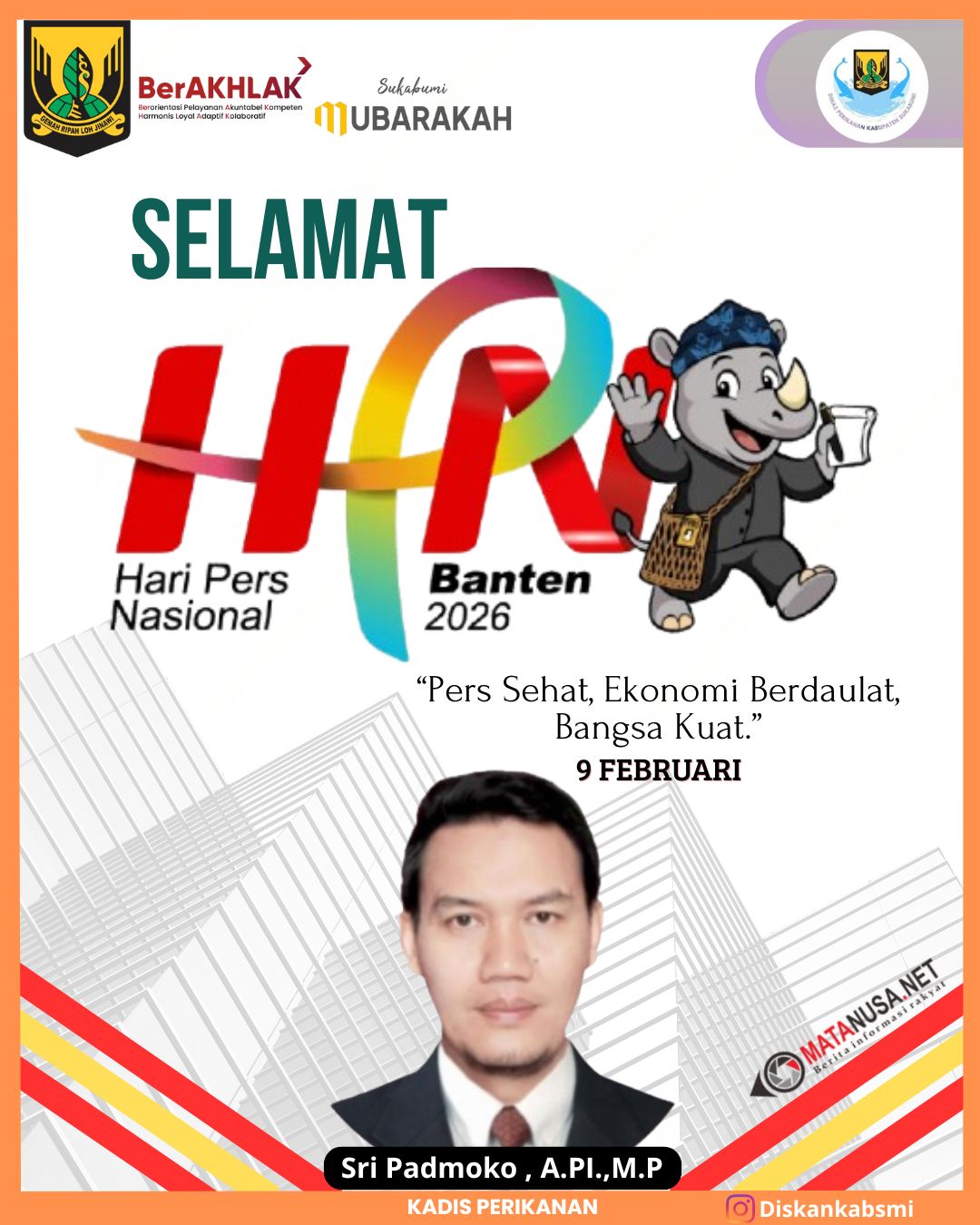 Sukabumi | Matanusa.net – Kepala Dinas Perikanan Kabupaten Sukabumi, Sri Padmoko, A.Pi., M.P., menyampaikan ucapan Selamat Hari Pers Nasional (HPN) Tahun 2026 yang diperingati pada 9 Februari 2026. Peringatan HPN tahun ini mengusung tema “Pers Sehat, Ekonomi Berdaulat, Bangsa Kuat” dengan lokasi peringatan tingkat nasional di Provinsi Banten.