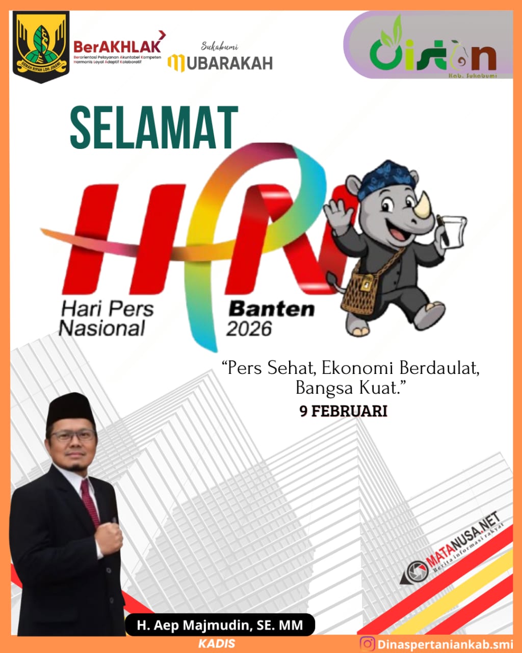 Sukabumi | Matanusa.net – Kepala Dinas Pertanian Kabupaten Sukabumi, H. Aep Majmudin, SE., MM., menyampaikan ucapan Selamat Hari Pers Nasional (HPN) Tahun 2026 yang diperingati pada 9 Februari 2026. Peringatan HPN tahun ini mengusung tema “Pers Sehat, Ekonomi Berdaulat, Bangsa Kuat” dan dilaksanakan secara nasional di Provinsi Banten.